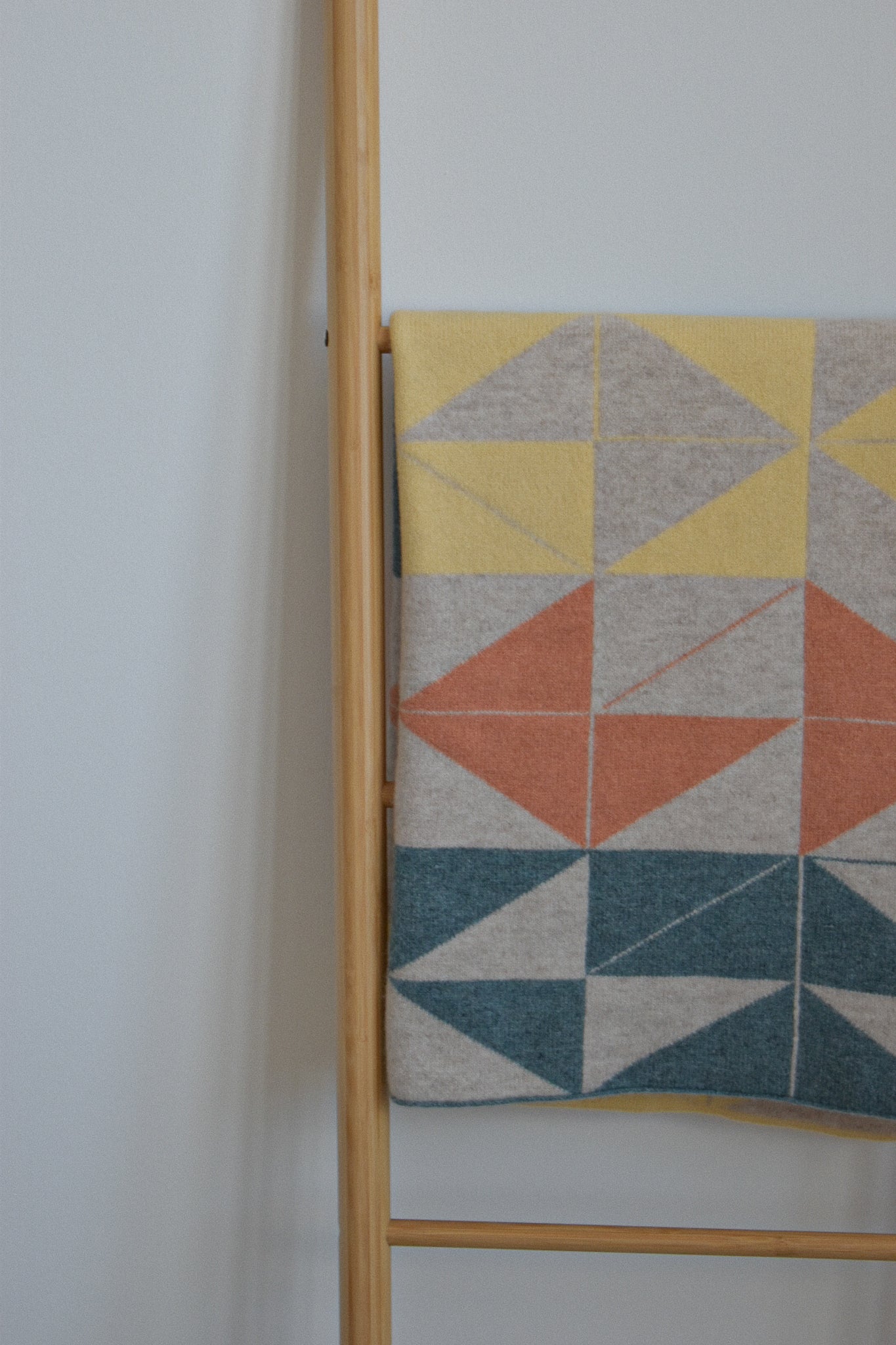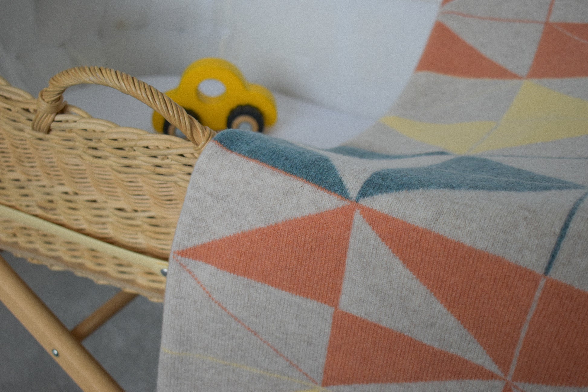 Coorie baby blanket, designed by Hannah, draws on inspiration from her interest in shape, form and pattern. The reverse double jacquard design, combined with Hannah's carefully considered colour palette creates a playful yet subtle composition, differing slightly on both sides.