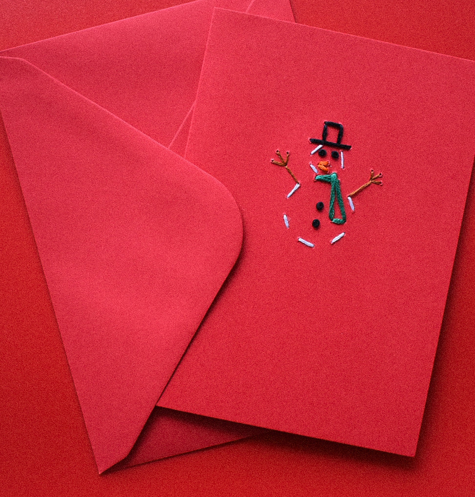 A unique hand embroidered A6 greeting card with 'Snowman' design.